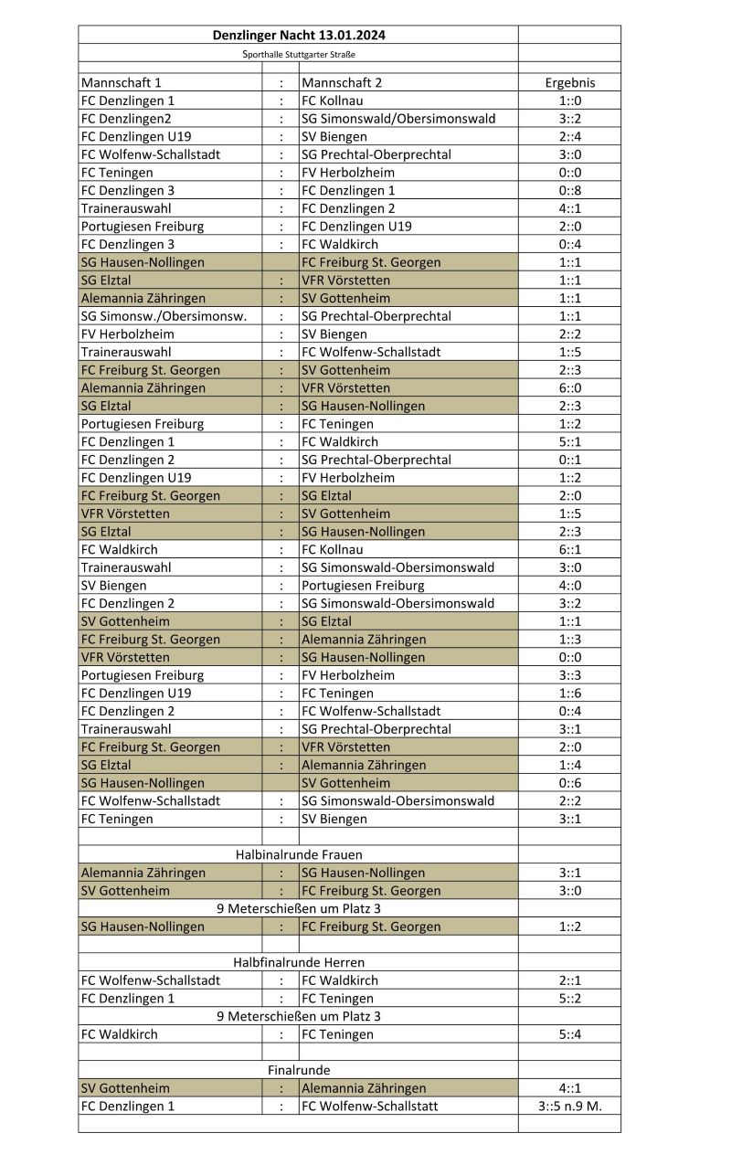 Der Hegauer SV bei den Frauen und der FC Denzlingen I bei den Herren wurden Sieger bei der 34. Denzlinger Nacht. Hegau besiegte den SV Gottenheim im Endspiel mit 4:2, während das Endspiel bei den Herren zwischen dem FC Emmendingen und dem FC Denzlingen nach dreimaliger Führung der Kreisstädter von den Gastgebern noch mit 4:3 gewonnen werden konnte Die 3. Plätze belegten die Frauen vom SvO Rieselfeld und bei den Herren der VfR Hausen. Ergebnisse der Finalrunden: