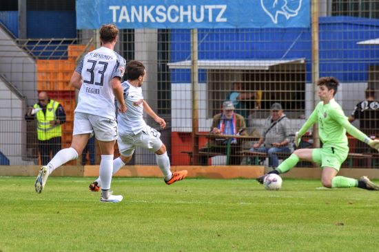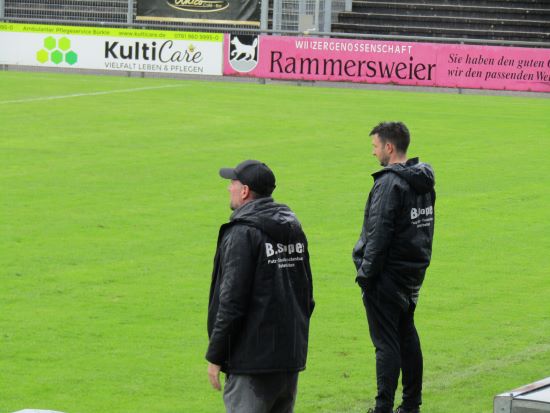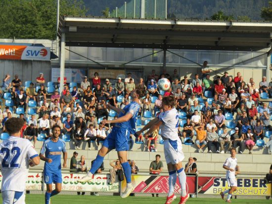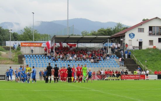 Oberliga BW FCD 1 - SG Sonnenhof-Großaspach 0:3 (0:2) Die Gäste begannen mit viel Schwung und bereits nach knapp 2 Minuten klingelte es erstmals im Denzlinger Kasten. Ein langer Ball auf den völlig freistehenden Mbem-Som Nyamsi nutzte dieser zum 0:1. Selbst ein so guter Torhüter wie Marvin Mettenberger war da machtlos. In der 5. Min. steuerte Anes Vrazalica zunächst alleine aufs Gästetor zu, wurde aber von einem Gästespieler noch abgelaufen und vom Ball getrennt. In der 7.Min. beinahe das 0:2, aber Mettenberger bügelte einen misslungenen Klärungsversuch eines Mitspielers mit einer tollen Reaktion aus. In der 9. Min. verletzte sich SR Marvin Monnnger, aber die heilenden Hände von Denzlingens Physiotherapeutin Mareike Strittmatter sorgten dafür, dass es nach einer kurzen Behandlungspause bis zum Schluss problemlos weitergehen konnte. Die Gäste blieben weitgehend spielbestimmend, aber der FCD hielt gut dagegen und nach einer sehenswerten Kombination über Matthis Eggert, Alex Echner und Hendrik Gehring lag der Ausgleich in der Luft, aber der abschließende Kopfball flog übers Tor. Besser machten es die Gäste in der 27. Min. Nach Zuspiel von Bleart Dautaj konnte Dominik Salz ungehindert zum 0:2 einschießen. Mettenberger war es in der 34. Min. zu verdanken, dass Volkan Celiktas, der freie Schussbahn hatte, nicht auf 0:3 erhöhen konnte. Dann war mal wieder der FCD an der Reihe. Zunächst machte Eggert statt zu schießen noch einen Schlenker und verlor dadurch den Ball und kurz vor der Halbzeit prüfte Eggert mit einem gefährlichen Schuss aus gut 25 Metern SG-Torhüter Max Reule, der gerade noch die Hände hochreißen und den Ball zur Ecke lenken konnte. Der folgende Eckball brachte nichts ein und so ging es mit dem 0:2 in die Pause. In der zweiten Hälfte spielte sich die Partie weitgehend zwischen den Strafräumen ab. Der FCD hätte allerdings nochmals für Spannung sorgen können, wenn nicht Reule einen platzierten Kopfball von Echner nach einer Ecke gerade noch von der Linie gekratzt hätte. So schien alles auf das 0:2 hinaus zu laufen, bis Mbem-Som Nyamsi in der 2. Min. der Nachspielzeit aus gut 30 Metern plötzlich abzog und sein Schuss zum 0:3 Endstand ins Netz rauschte. (ds) ![]() Der kleine aber unermüdlich anfeuernde Gästefanclub ![]() Dominik Saltz, der Schütze zum 0:2, hier bewacht von Nico Garcia Stein | ||||||||||||||||||||||||||||||||||||||||||||||||||||||||||||||||||||||||||||||||||||||||||||||||||||||
