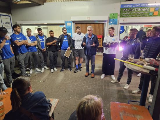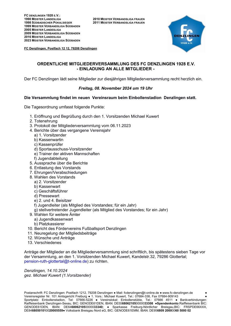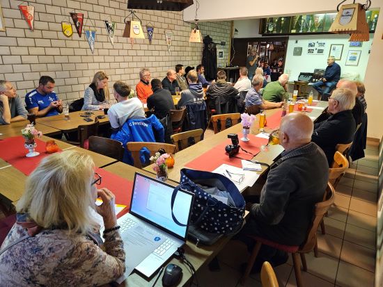 Im vollbesetzten neuen Vereinsraum fand gestern die Mitgliederversammlung des FCD statt. Näheres hierzu ist in der Stadionzeitung zum Spiel am Samstag, den 10. 11.24 gegen den Freiburger FC zu finden. Hier die Ergebnisse der Vorstandswahlen. Lt. Satzung sind in Jahren mit gerader Endziffer zu wählen: 2. Vorsitzender: Jan Kath, wie bisher Kassenwartin: Elke Niepenberg, wie bisher Geschäftsführer: Klaus Reichenbach, neu Pressewart: unbesetzt Beisitzer: Judith Boenke (wie bisher), Walter Ott (neu, bisher: Leiter Event-Team)) Jugendleiter: Marvin Schindler (bisher kommissarisch), Nick Schäffauer (neu) Jugendkassenwartin: Elke Niepenberg (wie bisher) > ![]() Blick in den Saal ![]() Jubilare von links: 50 Jahre: Günter Welz, jeweils 70 Jahre: Hans Bross und Wilfried Dufner ![]() Vorstand von links: Marvin Schindler (Jugendleiter), Nick Schäffauer (neu, stellv. Jugendleiter), Markus Schopp (Beisitzer), Jan Kath (2. Vorsitzender), Elke Niepenberg (Kassenwartin Hauptverein + Jugend), Michael Kuwert (1. Vorsitzender), Walter Ott (neu, Beisitzer), Horst Bühler (Sportl. Leiter), Klaus Reichenbach (neu, Geschäftsführer) -- Es fehlt Judith Boenke (Beisitzerin) | ||||||||||||||||||||||||||||||||||||||||||||||||||||||||||||||||||||||||||||||||||||||||||||||||||||||