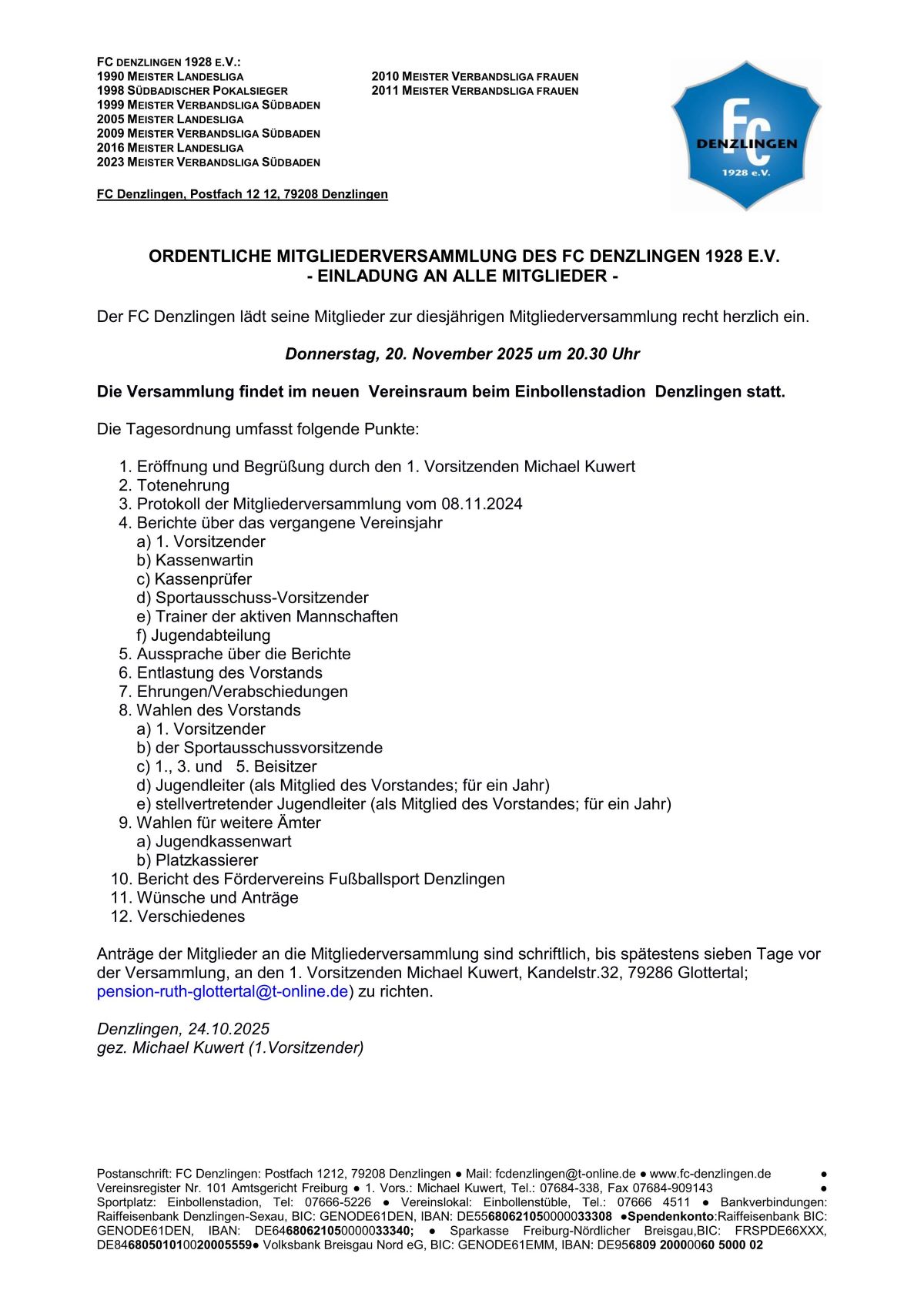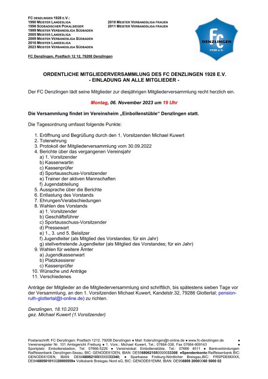 Neue Jugendleitung Marvin Schindler und Stefan Reinbold sind die neue Leitung (Kommissarisch) der Jugendabteilung des FC Denzlingen. Jugendtrainer beim FC Denzlingen gesucht Die Jugendabteilung des FC Denzlingen sucht engagierte Trainer unserer jungen Talente. Interessierte können sich per E-Mail an Jugendleiter@fc-denzlingen.de melden. Probetraining beim FC Denzlingen Interessierte an einem Probetraining in einer Jugendmannschaft des FC Denzlingen können sich unter folgender E-Mail- Adresse melden: Jugendleiter@fc-denzlingen.de. Wir freuen uns darauf, neue Talente bei uns willkommen zu heißen! Weitere interessante Infos aus der Jugendabteilung. | ||||||||||||||||||||||||||||||||||||||||||||||||||||||||||||||||||||||||||||||||||||||||||||||||||||||