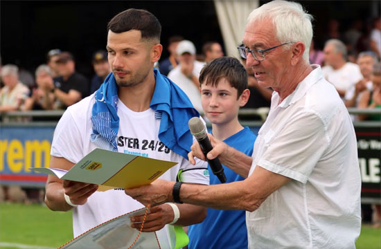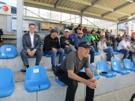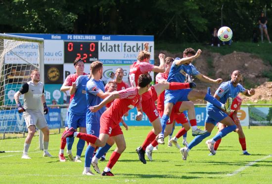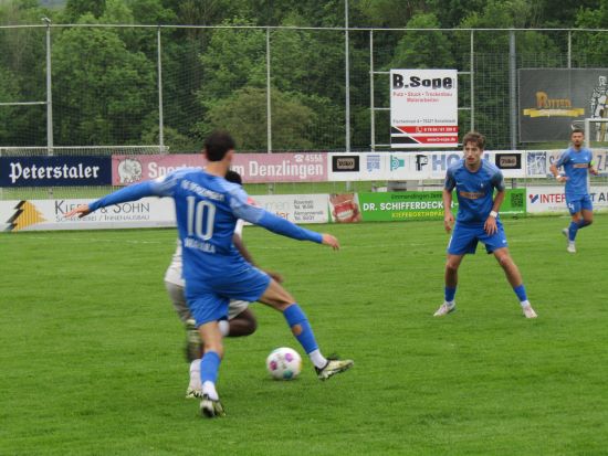 Verbandsliga: Türk.SV Singen - FCD 1 4:3 (0:3) Der FCD ging nach 18. Min. durch Nikita Ebel mit 0:1 in Führung. Für den Halbzeitstand von 0:2 sorgte in der 39. Min. Anes Vrazalica. Als Ebel mit seinem zweiten Treffer in der 55. Min. die Gästeführung auf 0.3 ausbaute, schien das Rennen für den Spitzenreiter fast schon gelaufen. Als aber nur zwei Minuten nach dem 0:3 der Torschützenkönig der Verbandsliga Abdoulie Mboob auf 1:3 verkürzte, begann dessen große Zeit. Noch in der regulären Spielzeit gelang ihm mit Treffern in der 68. und 78. Min. der 3:3 Ausgleich. Damit aber war der Torhunger von Mboob noch nicht gestillt, denn in der 5. Min. der achtminütigen Nachspielzeit sorgte er sogar noch für den vom Singener Anhang frenetisch gefeierten 4:3 Siegtreffer. Damit hat sich die Elf vom Hohentwiel die Möglichkeit erhalten, in den noch ausstehenden drei Spielen den FCD doch noch von der Spitze zu verdrängen. (ds) Bezirksliga: FCD 2 - SV BW Waltershofen 1 1:1 (1:1) Das war heute ein echter Spitzenkampf, bei dem beide Mannschaften sich nichts schenkten. Die erste Tormöglichkeit hatten die Platzherren bereits nach zwei Minuten, aber Tim Lettgen schoss einen Freistoß aus ca. 30 Metern über den Kasten. Anschließend setzten sich die Gäste geraume Zeit in der Denzlinger Hälfte fest und hatten auch zweimal gute Möglichkeiten in Führung zu gehen. So als ein Gästestürmer im Strafraum frei zum Schuss kam, aber der sich wieder in prächtiger Form präsentierende FCD-Schlussmann Mehmet Demirdögen diesen unschädlich machen konnte. Drei Minuten später war aber das Glück auf seiner Seite, als ein strammer Schuss von links knapp am langen Pfosten vorbeirauschte. In der 19. Min. dann wieder mal eine Tormöglichkeit für die Einheimischen. Yan Slipchenko setzte sich auf der linken Seite durch, aber Lettgen brachte sein Zuspiel nicht richtig unter Kontrolle. Nur drei Minute später leistete Lettgen die Vorarbeit, Nelio Lemminger nahm dessen Zuspiel auf, setzte sich gegen drei Gegenspieler durch und vollendete zum 1:0. Danach musste Demirdögen dreimal rettend eingreifen, um den Ausgleich zu verhindern. In der 37. Min. war es dann aber doch passiert. Carlo Rösler nutzte eine zu kurze Abwehr zum 1:1 Ausgleich. Die Schlussminuten der 1. Hälfte gingen an die Platzherren, es blieb aber beim 1:1. Auch die 2. Hälfte begann mit einer guten Torgelegenheit für den FCD. Nelio Lemminger wurde kurz vor der Strafraumgrenze gefoult, der fällige Freistoß blieb jedoch in der Mauer hängen. In der 63. Min. lag der Ball zwar im Gästenetz, aber die FCD-Offensive zögerte mit dem Abschluss zu lange und so stand der Schütze letztlich im Abseits. In der 68. Min. eine ähnliche Situation auf der Gegenseite, aber auch hier stoppte der Abseitspfiff des SR den Torjubel, diesmal der Gäste. Das Spiel wogte nun hin und her, insbesondere die Gäste wollten mit dem Siegtreffer der Meisterschaft einen entscheidenden Schritte näher kommen, aber die Platzherren ließen nichts mehr anbrennen. Letztlich ein gerechtes Unentschieden. (ds) Das Torschützenduo zum 1:0, Tim Lettgen (20) und Nelio Lemminger (23) Vollversammlung vor dem FCD-Tor Bild: Der neue Bürgermeister bei seinem Besuch am 12.04.25 im Einbollenstadion. (ds) | ||||||||||||||||||||||||||||||||||||||||||||||||||||||||||||||||||||||||||||||||||||||||||||||||||||||