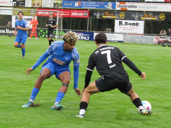 Verbandsliga: FC Teningen - FCD 1 0:0 Der FCD mache gleich mächtig Dampf und bereits in der 2. Min. hatte Nikita Ebel die Riesenmöglichkeit zum Führungstreffer. Nach einem Pass in die Tiefe lief er alleine Richtung FCT- Strafraum, zielte dann aber am linken Torpfosten vorbei. Mit fortschreitender Spielzeit wurde dann die Partie aber ausgeglichener. Als in der 41. Min. Alex Echner aufs Tor der Gastgeber stürmte, eilte ihm FCT-Torhüter Aaron Gut entgegen und brachte ihn außerhalb des Strafraums zu Fall. Echner ging zu Boden und SR Paul Züfle aus Radolfzell zog sofort den Roten Karton. Die Gastgeber mussten also die restlichen Minuten der ersten und die gesamte zweite Halbzeit mit einem Mann weniger auskommen. Nach Wiederbeginn hatten beide Teams ihre Möglichkeiten zum Führungstreffer. Nach und nach wurden die Gäste allerdings dominanter und der Führungstreffer lag mehrfach in der Luft. Die Gastgeber verteidigten jedoch leidenschaftlich. Der in der 57. Min eingewechselte Anes Vrazalica hatte danach zweimal die Möglichkeit den Bann zu brechen. Zunächst strich sein Schuss knapp am langen Pfosten vorbei und auch sein zweiter Versuch brachte nichts Zählbares ein. Ebenso konnten die Gäste aus mehreren Eckbällen kein Kapital schlagen. So jubelten zum Schluss die Gastgeber über den Punkt, den sie in Unterzahl dem Favoriten abknöpfen konnten. (ds) Akrobatische Einlage von Simon Leopold (Nr. 24.), beobachtet von Yannick Lawson | ||||||||||||||||||||||||||||||||||||||||||||||||||||||||||||||||||||||||||||||||||||||||||||||||||||||